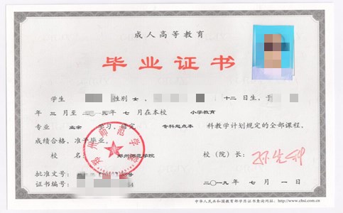 郑州师范学院成人高考毕业证样本