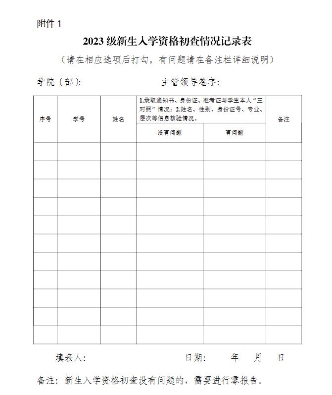 附件1(请在相应选项后打勾,有问题请在备注栏详细说明) 学院(部):主管领导签字:序号学号姓名1.录取通知书、身份证、准考证与学生本人“三对照”情况;2.姓名、性别、身份证号、专业、层次等信息核验情况。备注没有问题有问题填表人:日期:年月日备注:新生入学资格初查没有问题的,需要进行零报告。