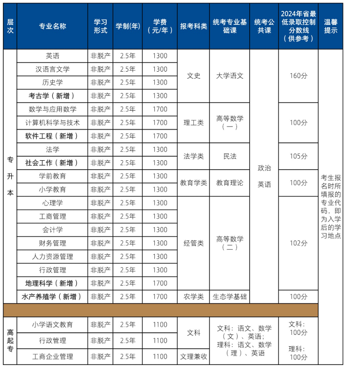 3.符合专升本报考条件的退役军人(专指自主就业退役士兵、自主择业军转干部、复员干部三类人员)和已取得普通高职(专科)毕业证书且“下基层”服务期满考核合格后报考专升本的考生,经省教育考试院审核,招生学校同意,可免试入学我省成人高校。