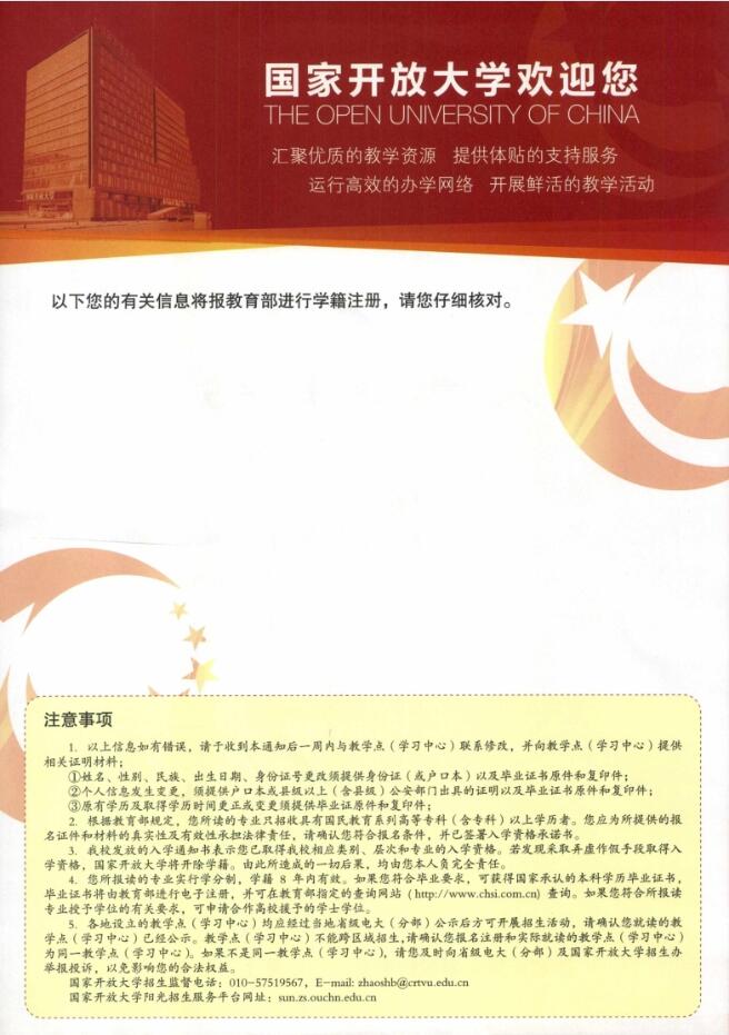 中央国家开放大学(国家开放大学)开 放教育是经国务院、教育部批准,主要面向在职成人的一种新型教育形式。学习者主要利用文字教材、计算机网络、多媒体教材、面授等, 远程教学平台自主学习。学生可以在家里通过网上直播、双向视频系统等网络交互手段进行学习,并与同学、教师 进行学习交流,也可到教学点参加集中面授或小组学习。
