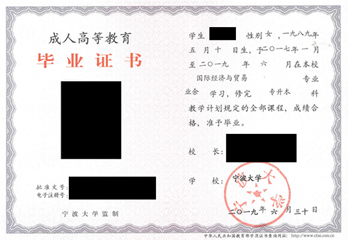 考生通过全国成人高考统一线下考试,被院校录取后,注册取得正式学籍并完成教学计划规定的课程,学习期满,通过毕业鉴定,将由宁波大学发给毕业证书。并上报国家教育部电子注册。